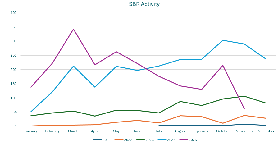 The graph above illustrates SBR activity from 2021 to 2025. Key observations: